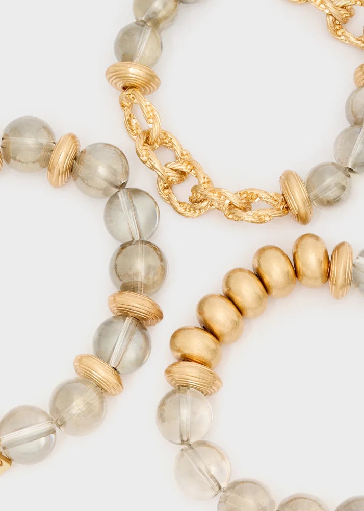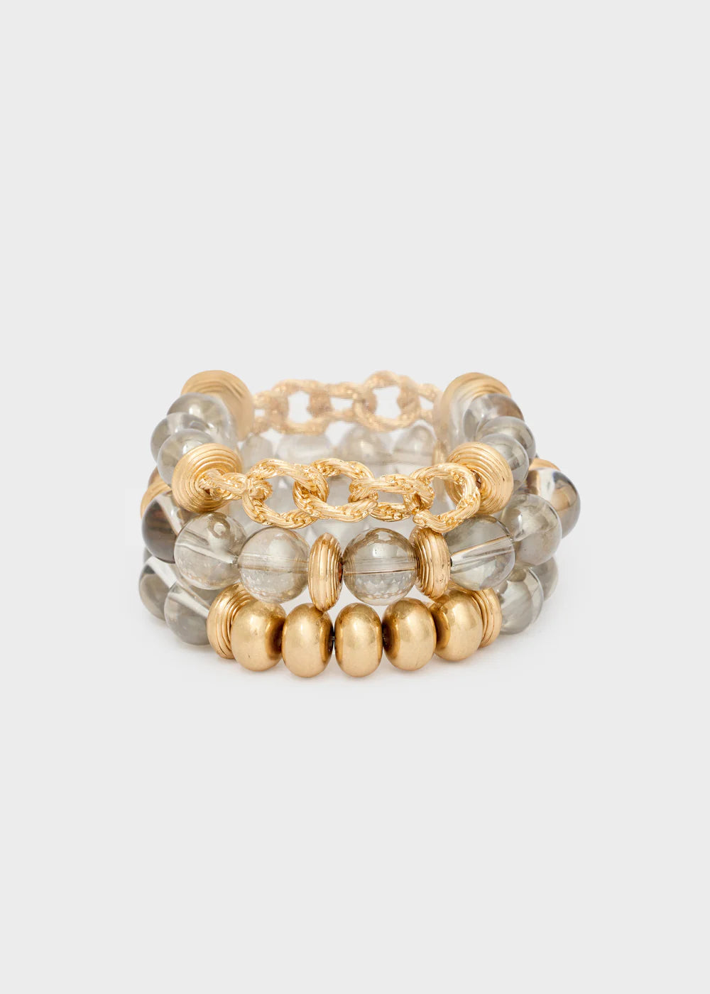 Bracciale multiplo elastico composto da elementi a perla liscia e inserti metallici, arricchito da una catena decorativa che aggiunge movimento e carattere. Il design stratificato crea un equilibrio tra stile moderno e dettagli classici, rendendolo un accessorio versatile e di tendenza. Perfetto per chi desidera un gioiello distintivo, adatto sia a look casual che più eleganti.