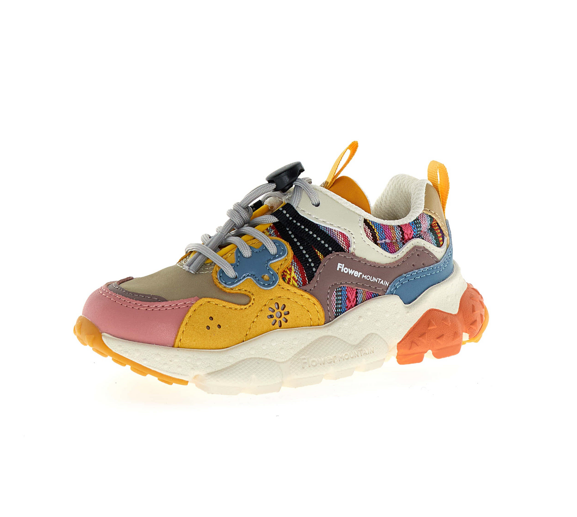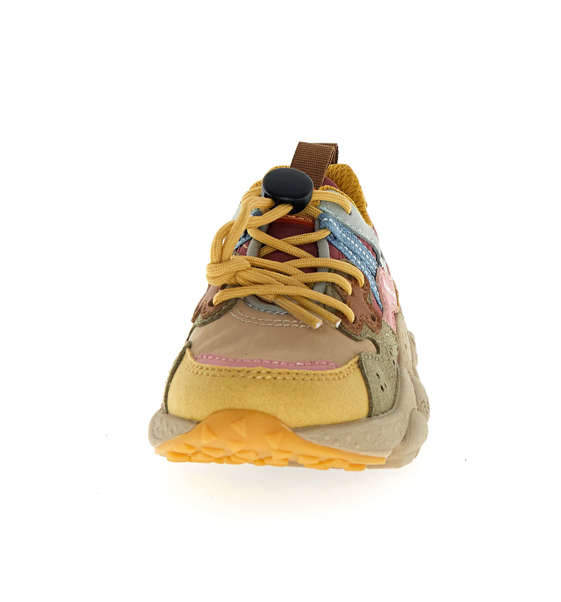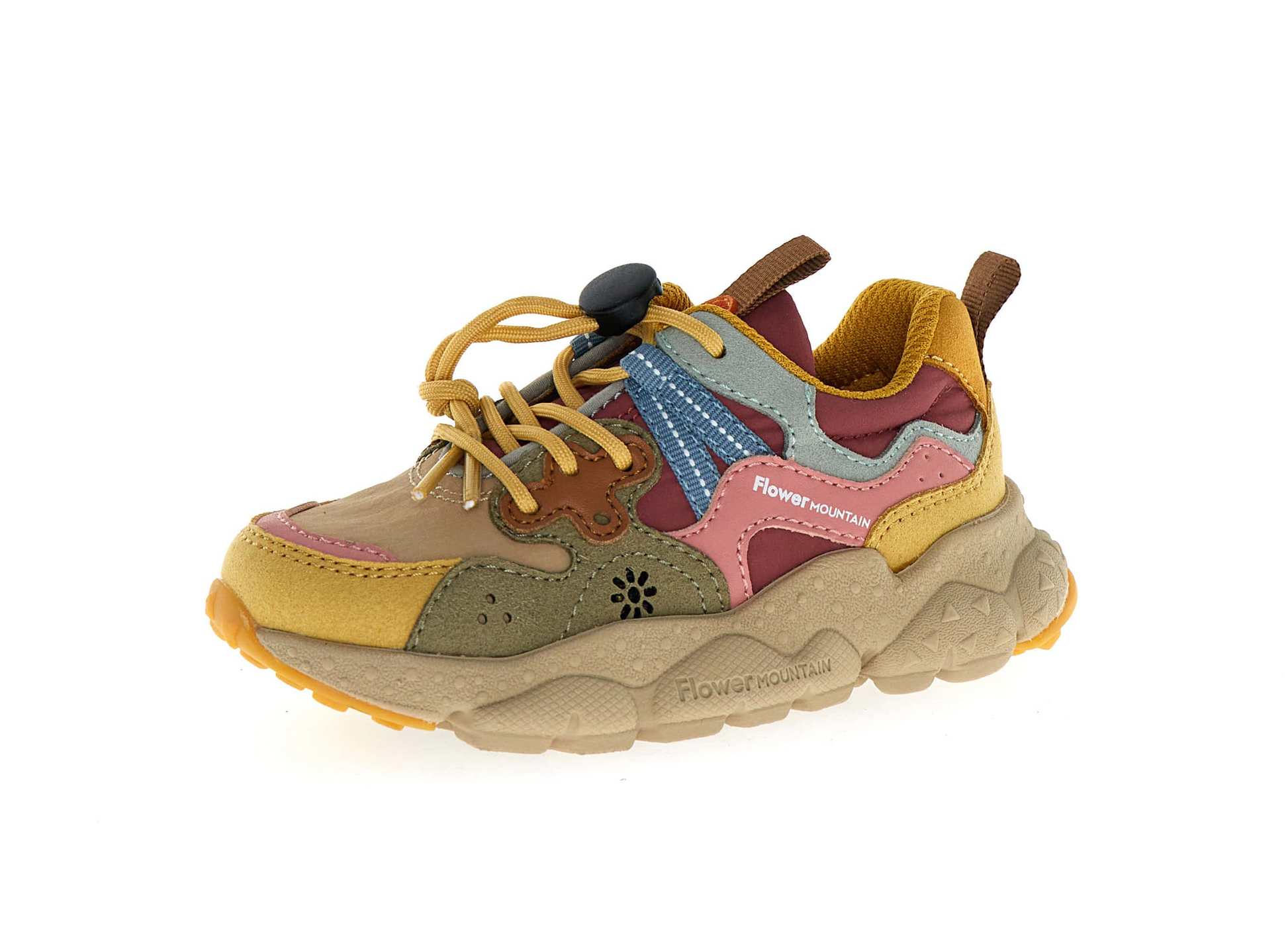 Sneaker con tomaia in ecopelle e tessuto, con intarsi e lavorazione overlapping. Chiusura con stringhe trekking e velcro . Fodera in tessuto e soletta in sughero naturale antibatterico. Fondo in gomma.