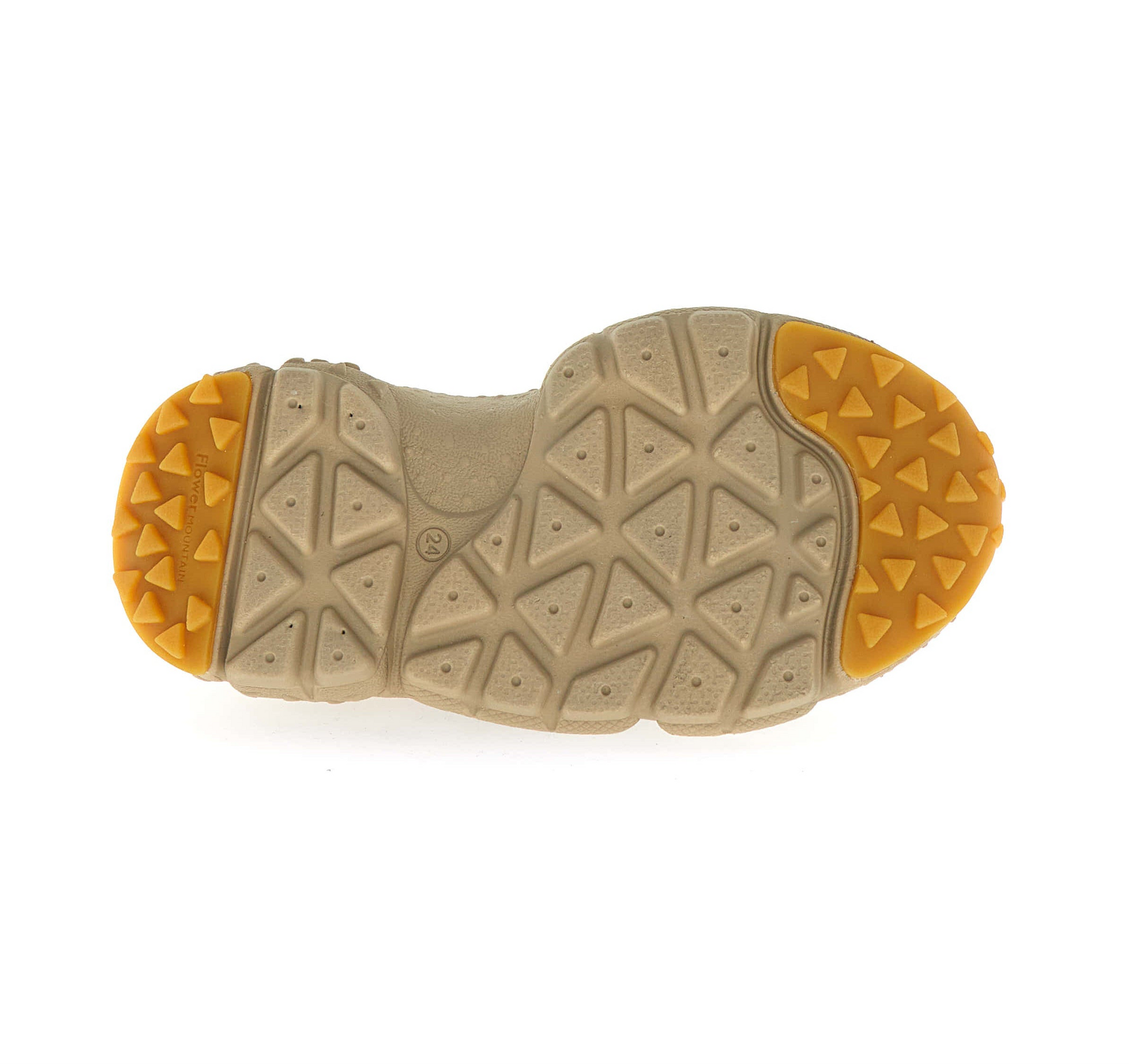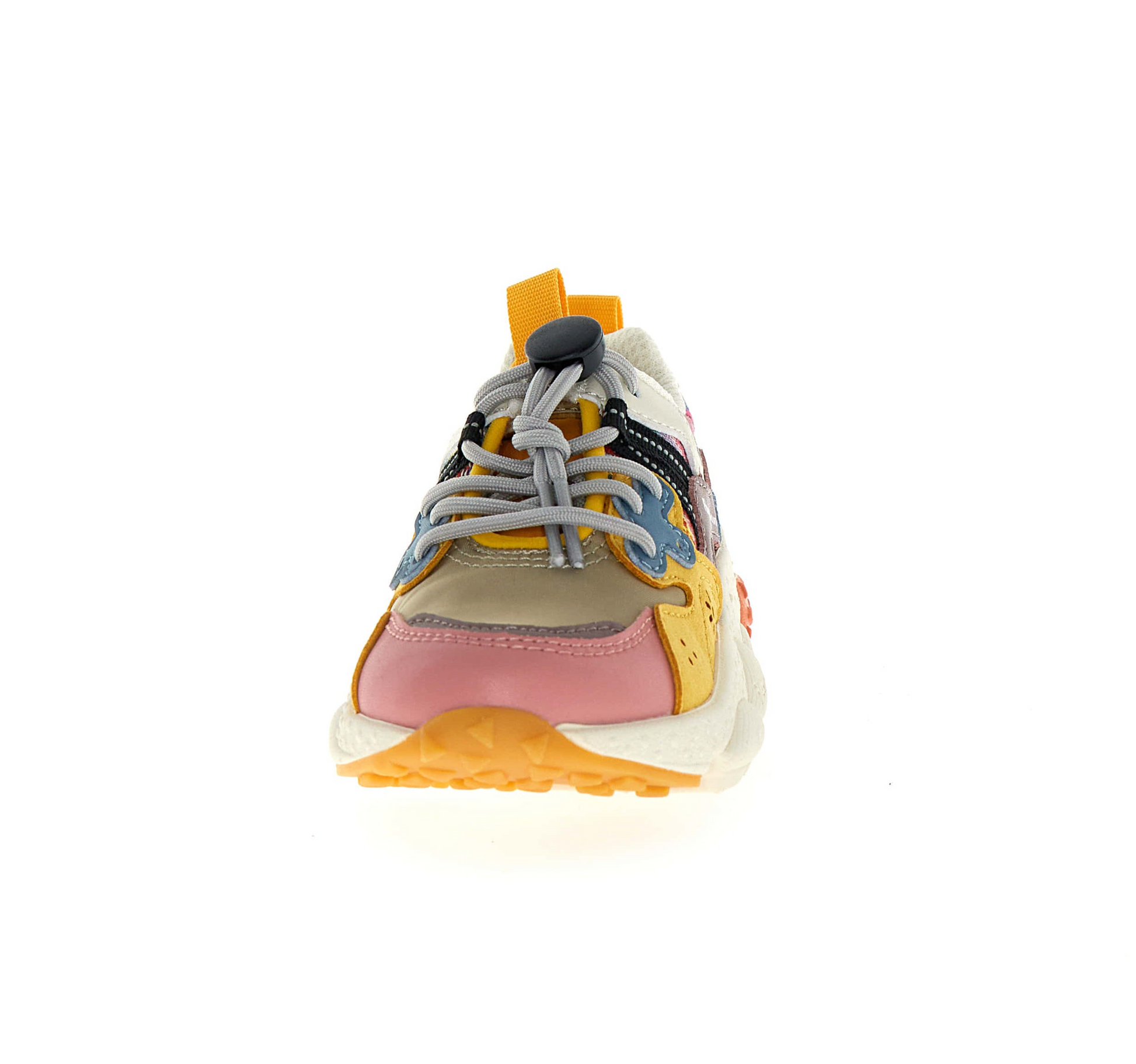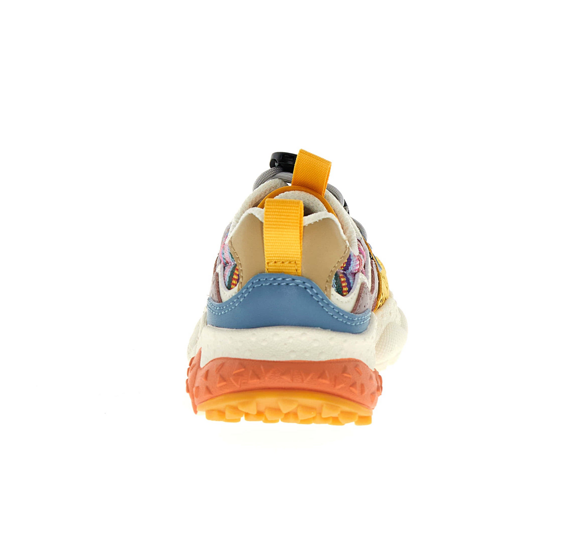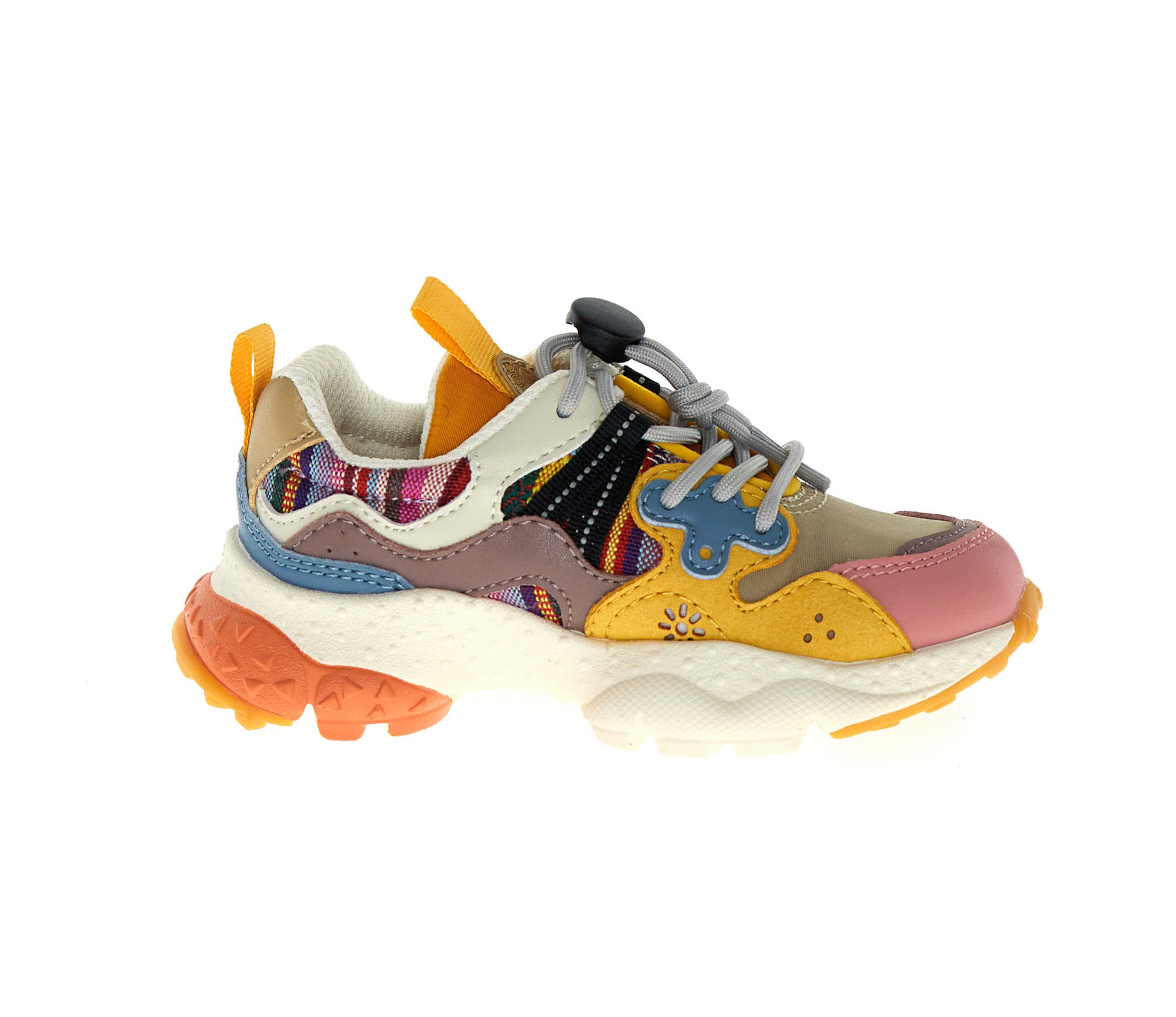 Sneaker con tomaia in ecopelle e tessuto, con intarsi e lavorazione overlapping. Chiusura con stringhe trekking e velcro . Fodera in tessuto e soletta in sughero naturale antibatterico. Fondo in gomma.