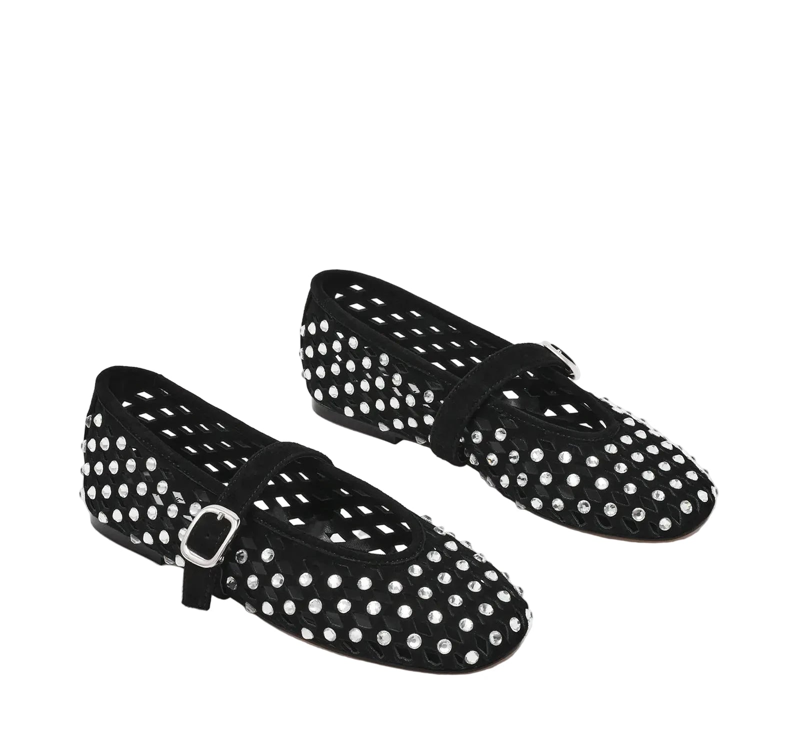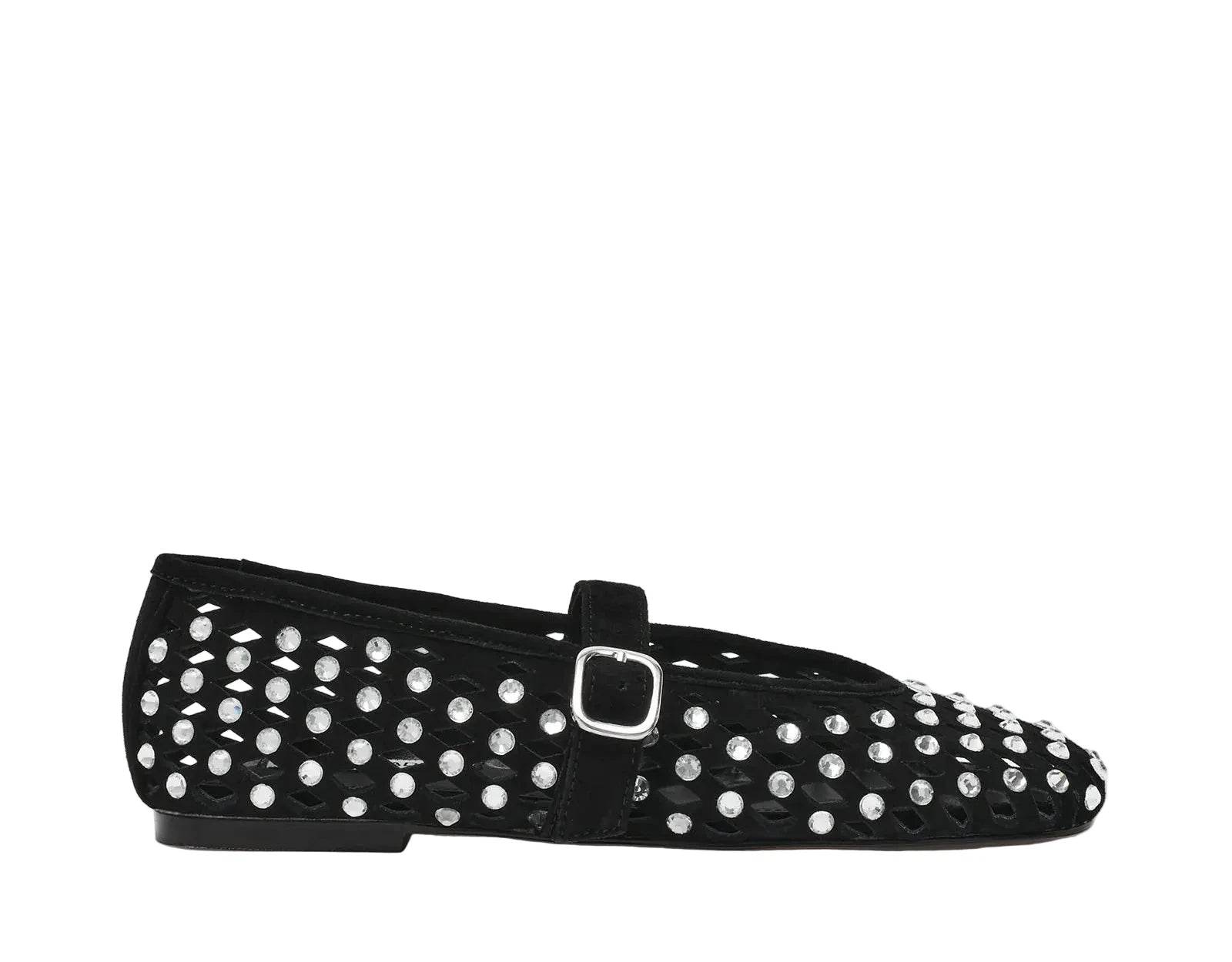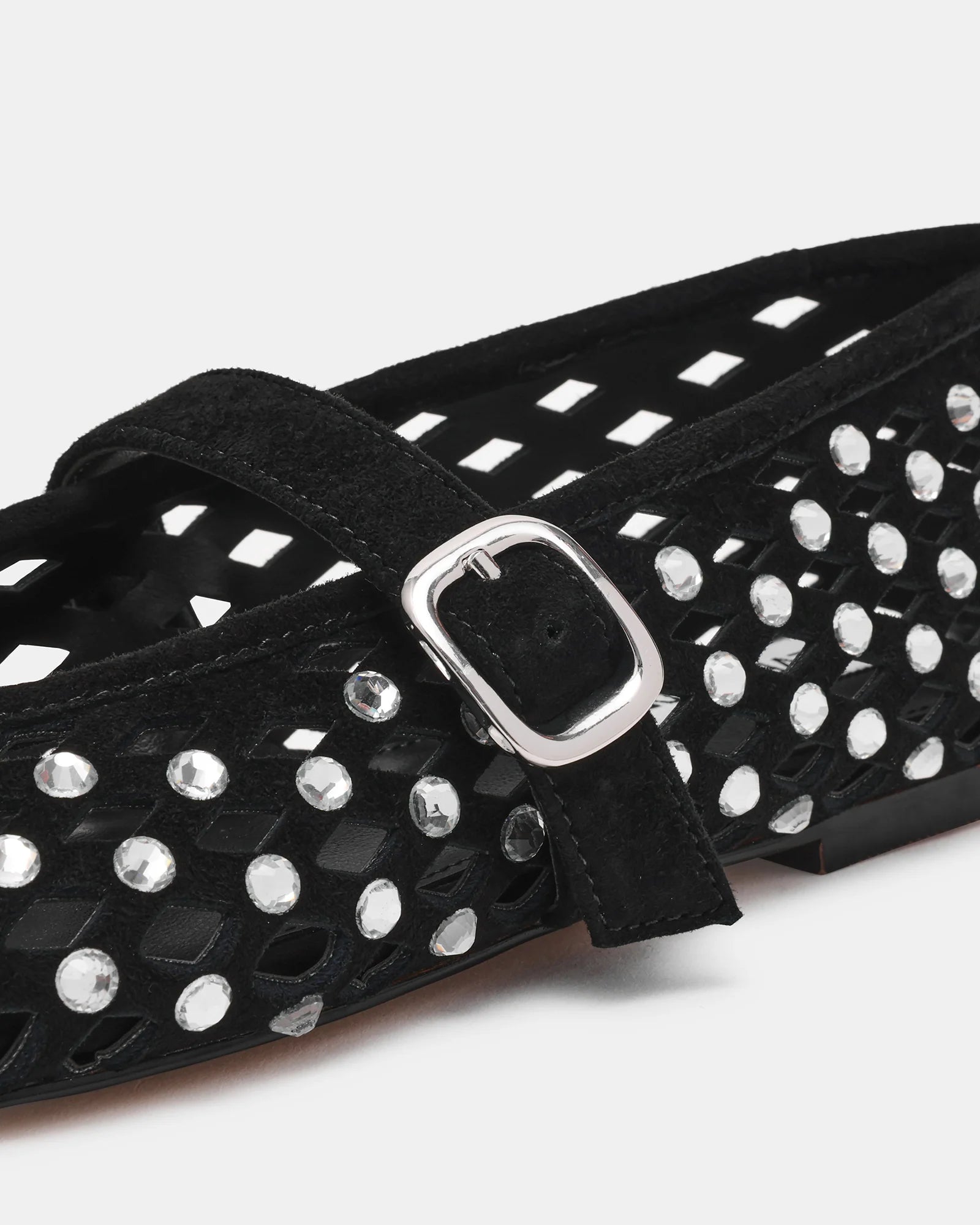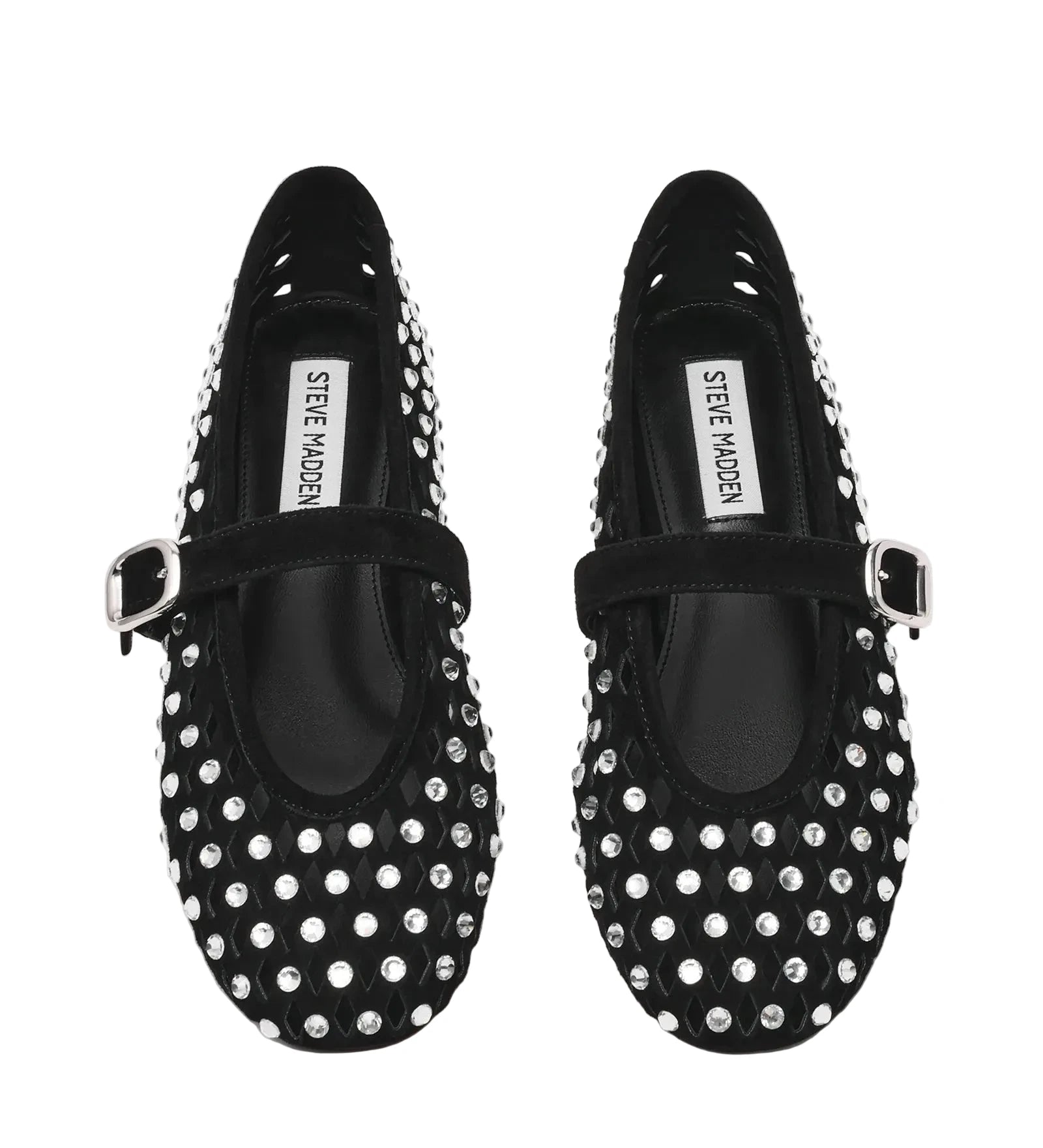 Ballerine Steve Madden Rerun con tomaia in suede, design classico con lavorazione forata decorata con strass all over e cinturino regolabile sul davanti.