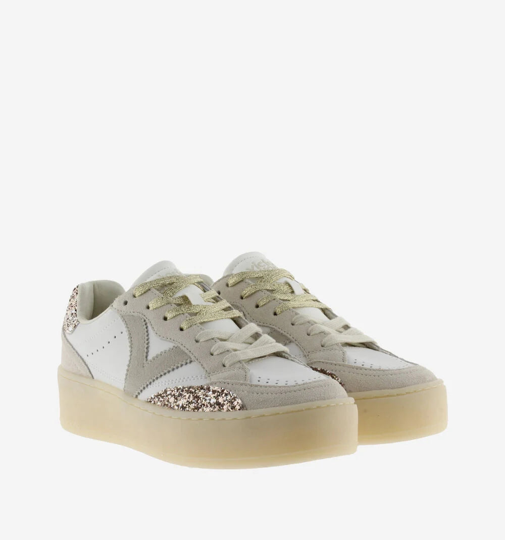 Sneakers con plateau da donna realizzate in pelle effetto bianco con sovrapposizioni in camoscio ed glitter. Chiusura con lacci bicolore: tono su tono e con leggero effetto metallizzato. Punta traforata per favorire la traspirazione. Suola in TPR traslucido color caramello.