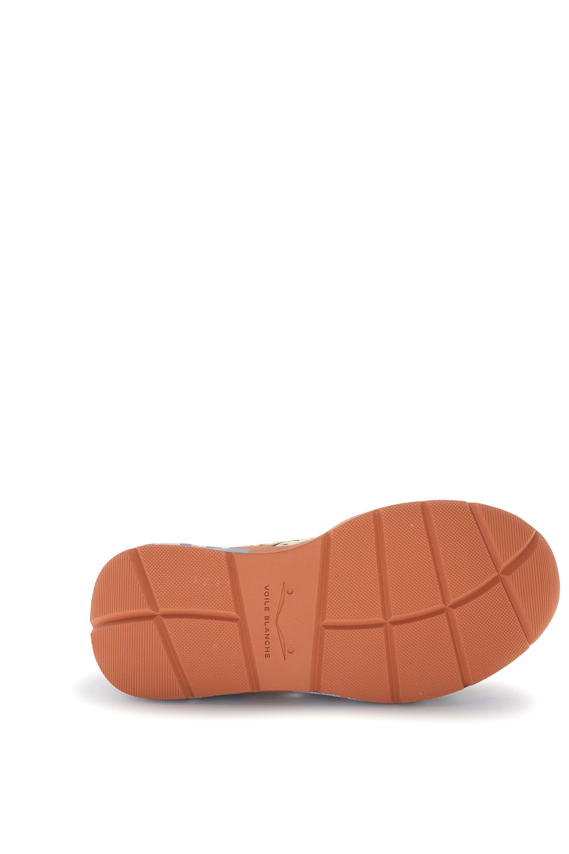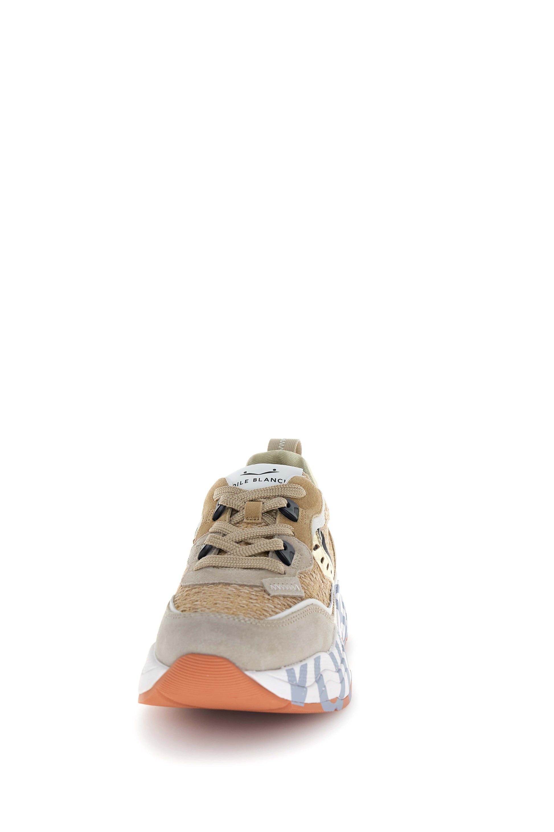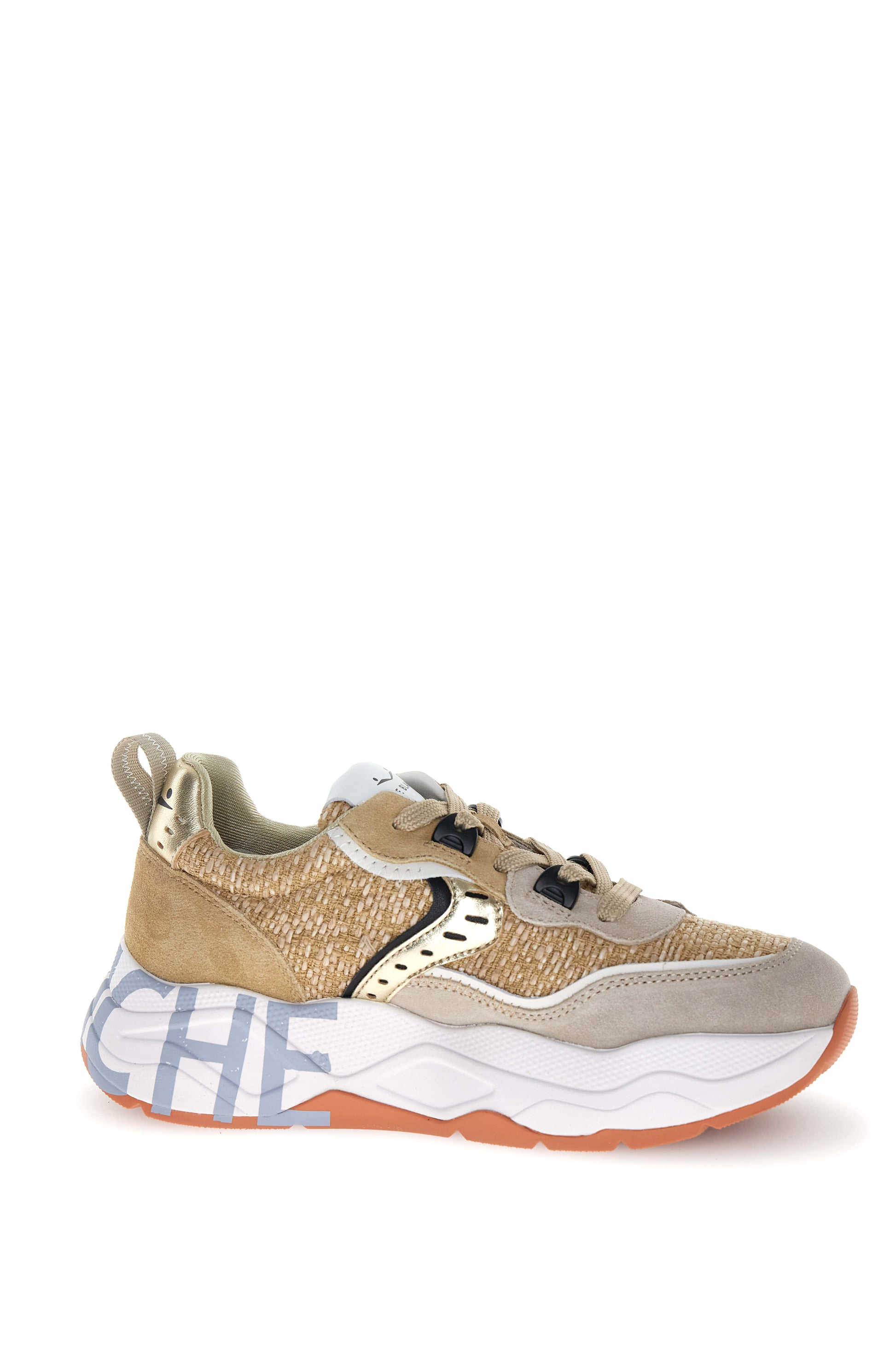 Sneaker in pelle e rafia con impunture in tinta. Suola a doppia altezza con stampa serigrafica laterale.