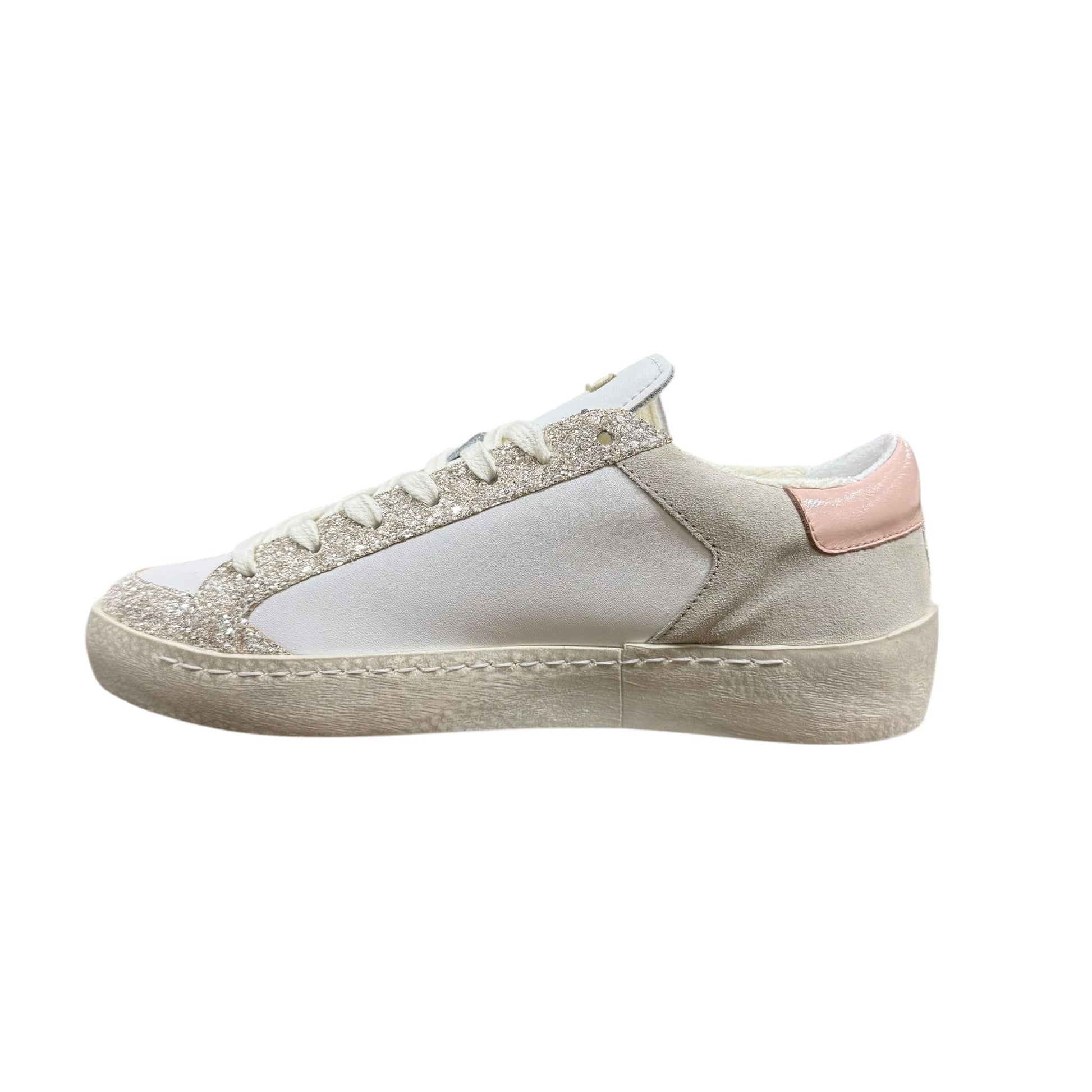 La tomaia combina pelle e suede color beige con dettagli glitter , valorizzata dall’iconica stella rosa sul lato, che dona un tocco originale .