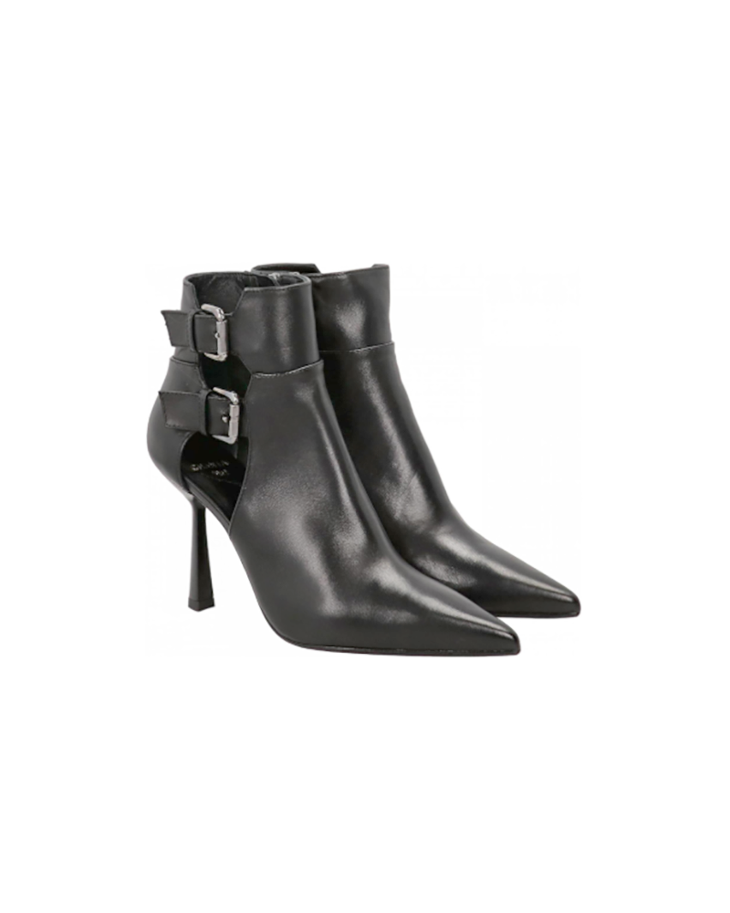 Tronchetto in pelle con tacco con doppia fibbia regolabile, lato esterno e zip late interno. Suola in cuoio e gomma. Tacco 90.