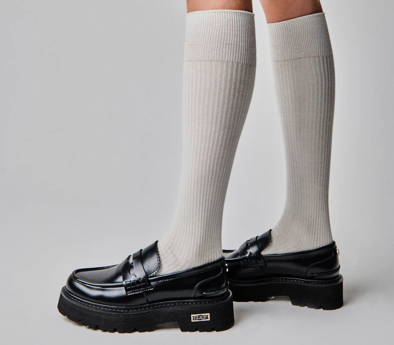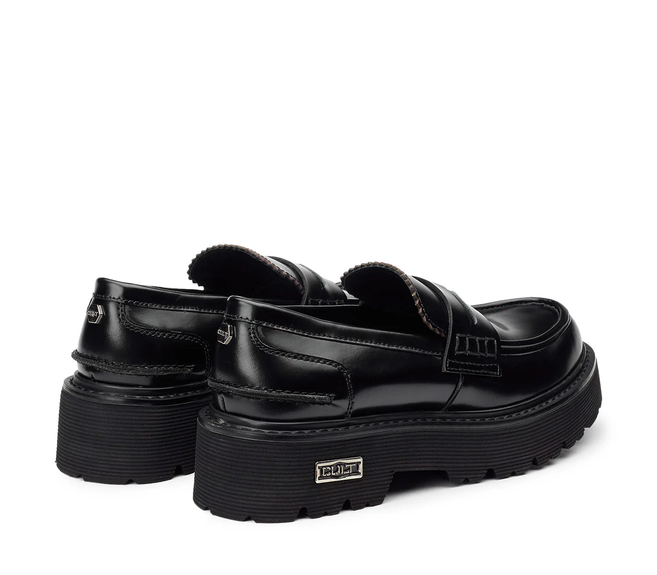 Intramontabili i mocassini della linea Slash firmati da Cult per questo inverno. In pelle spazzolata nera, questi mocassini con spessa suola in EVA, sono un must per la comodità e presentano l'iconica targhetta logata metallica. Da indossare sotto gonne o pantaloni per un look rock chic