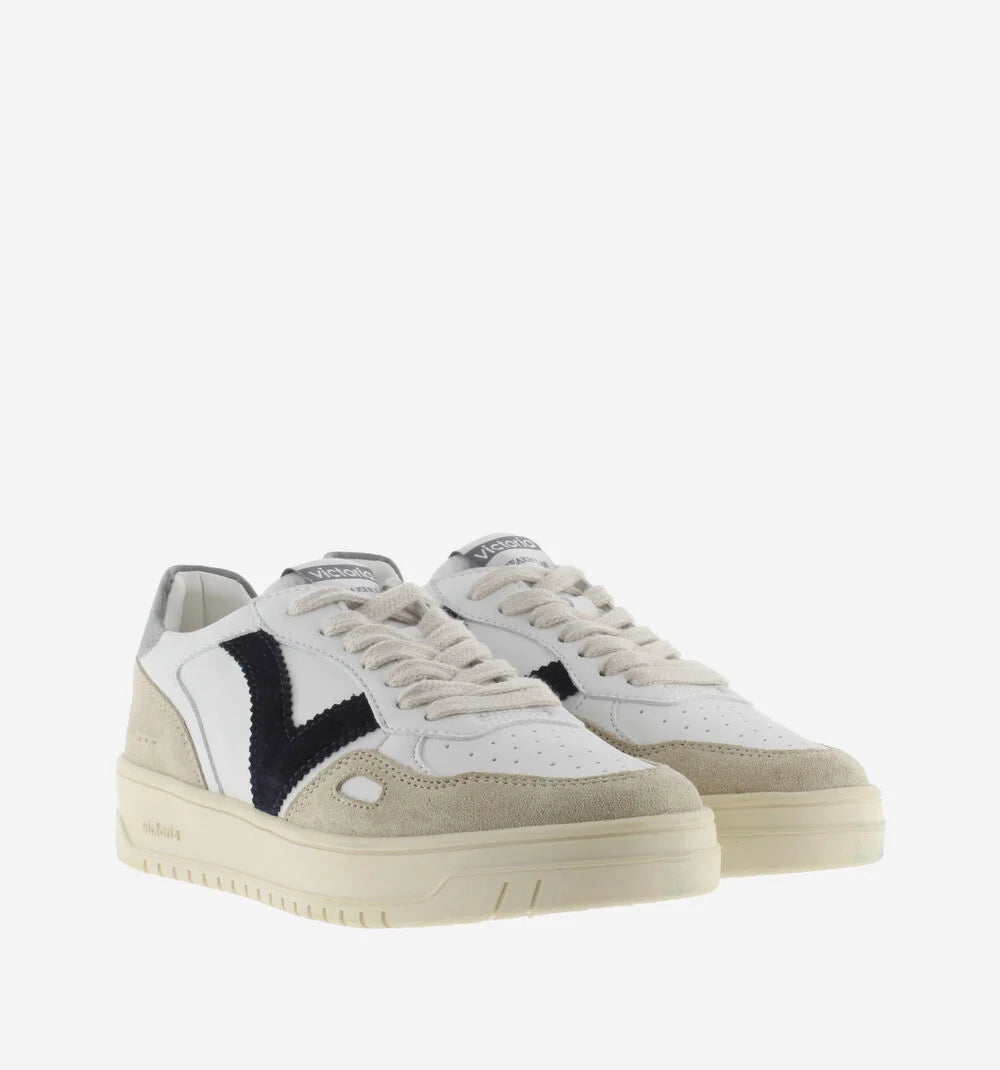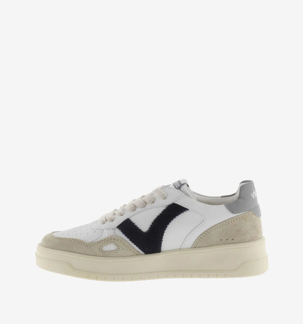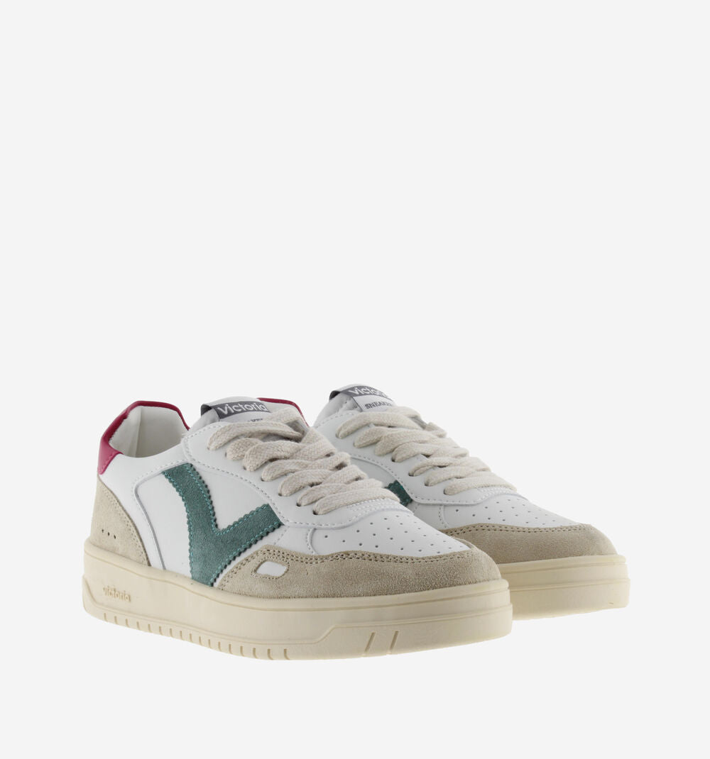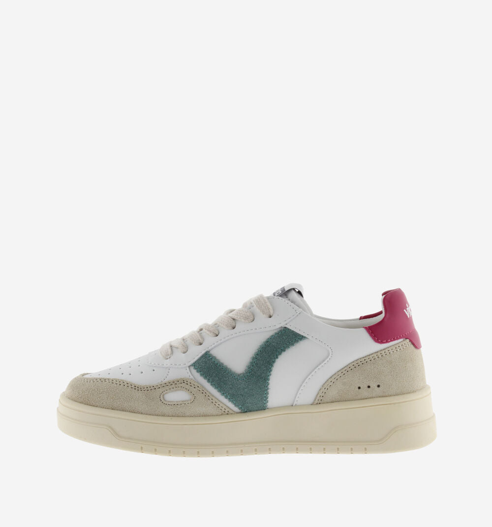 Sneakers sportive bianche unisex realizzate in materiale effetto pelle e inserti in crosta di pelle. Dettagli colorati nella V laterale e nel inserto posteriore con il logo del marchio. Dettaglio a finestra sul lato. Suola leggermente ambrata di 3,5 cm. Comprendono una soletta estraibile imbottita per un maggiore comfort.