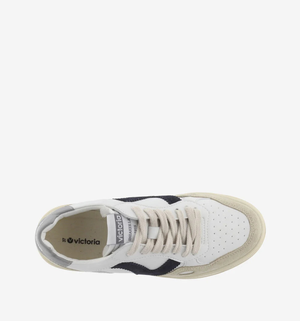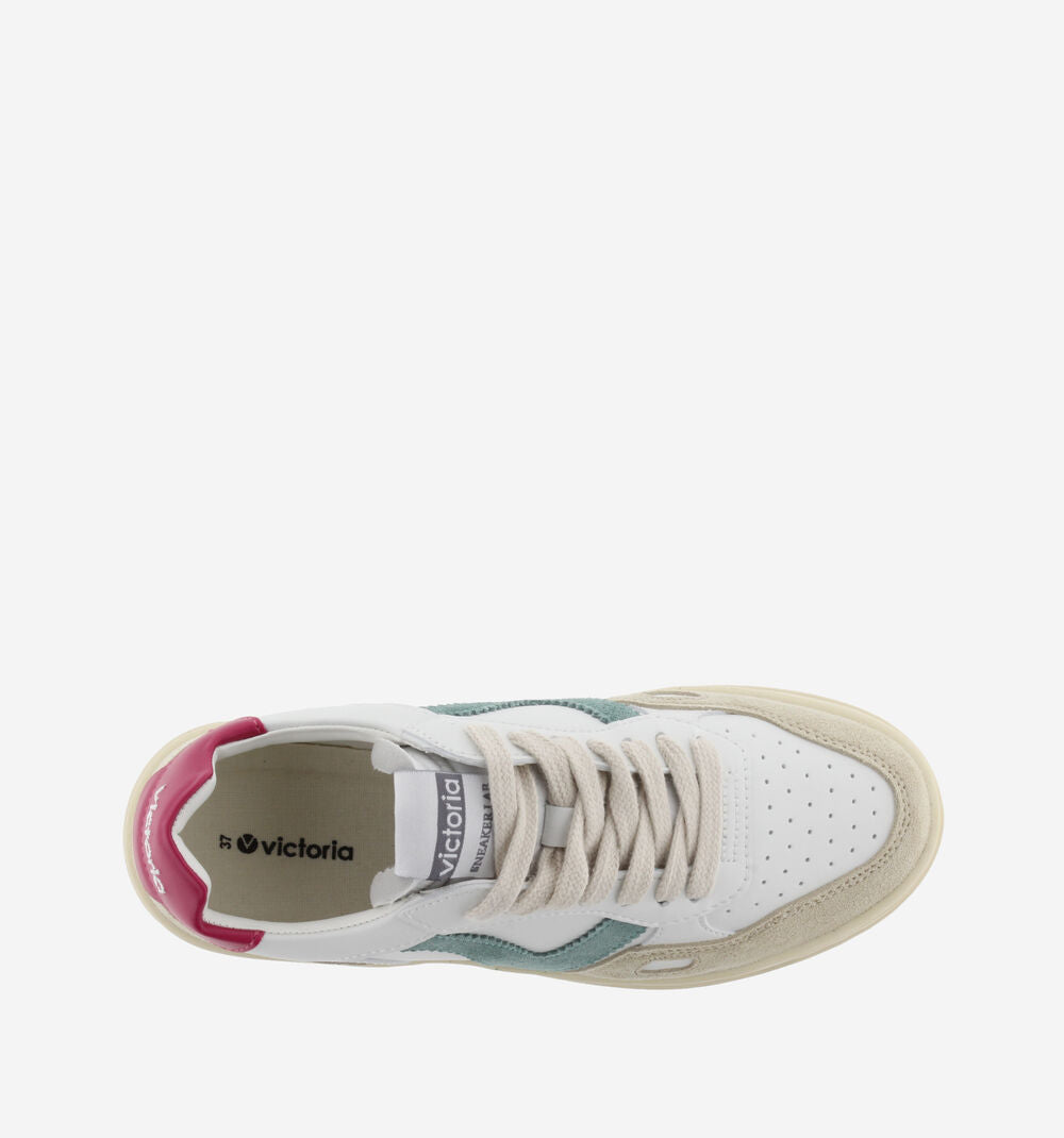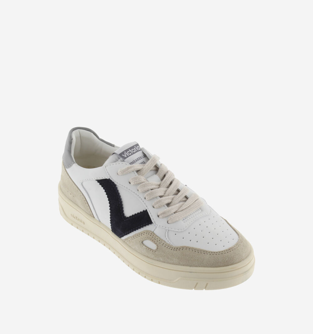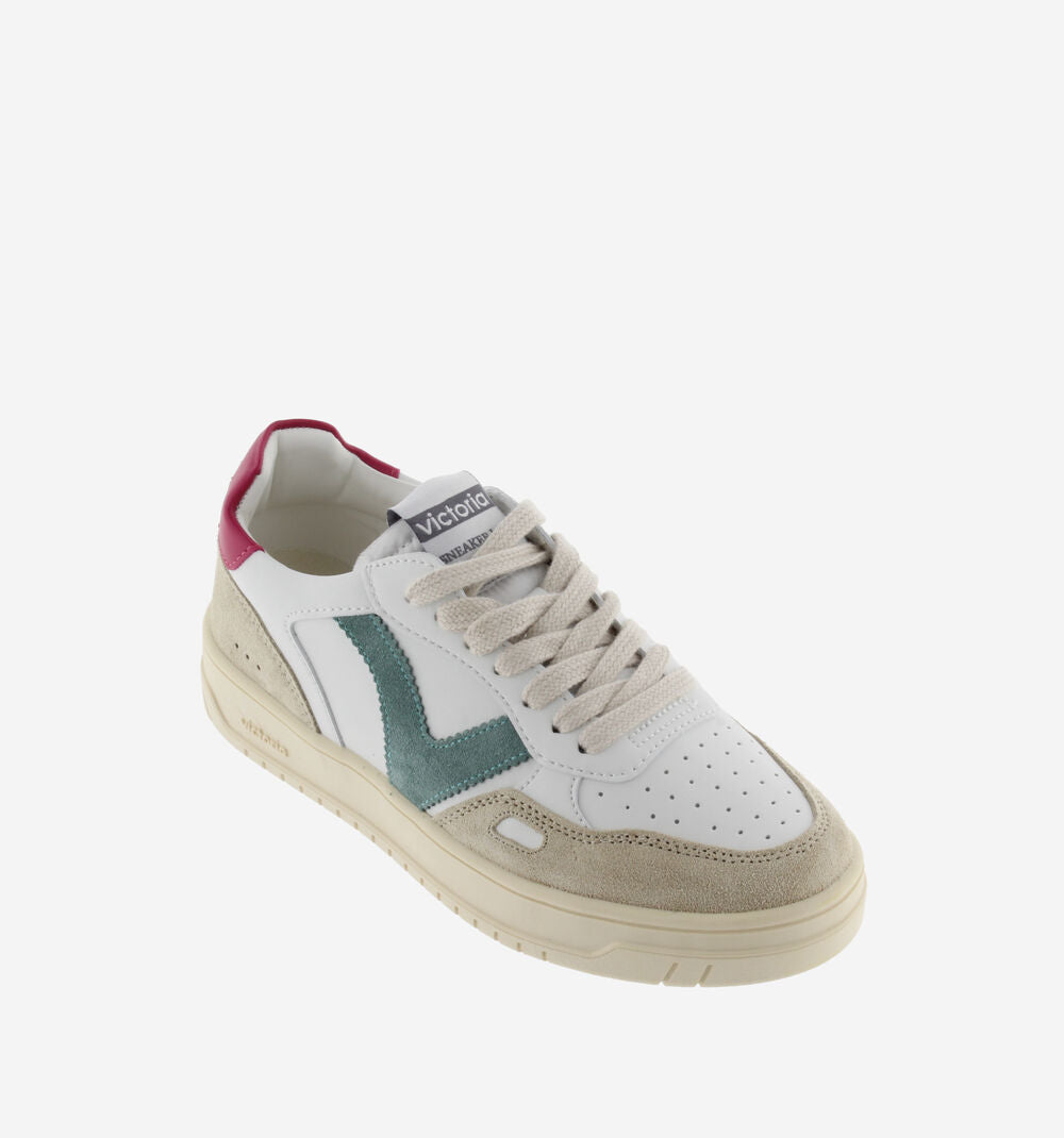 Sneakers sportive bianche unisex realizzate in materiale effetto pelle e inserti in crosta di pelle. Dettagli colorati nella V laterale e nel inserto posteriore con il logo del marchio. Dettaglio a finestra sul lato. Suola leggermente ambrata di 3,5 cm. Comprendono una soletta estraibile imbottita per un maggiore comfort.